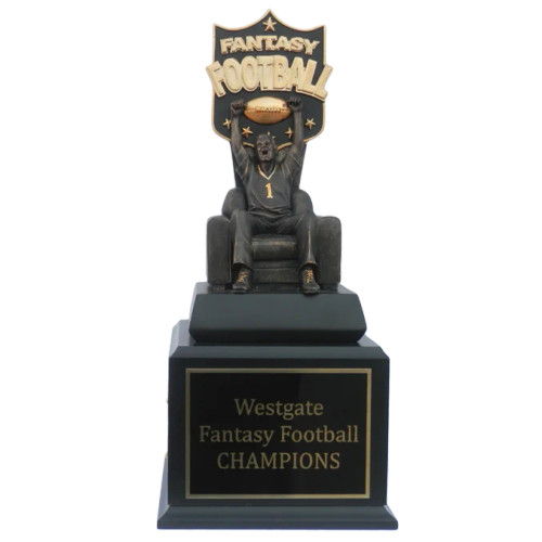 Send your Fantasy Football League to the next level with this super fan in a chair on top of a wooden base. THis trophy has 12 perpetual plates for 12 years of service for your league. It also include a header plate that can be used to display your league of team name on the front. Free Engraving for the Header Plate included. Current Production Time: 5 Business Days